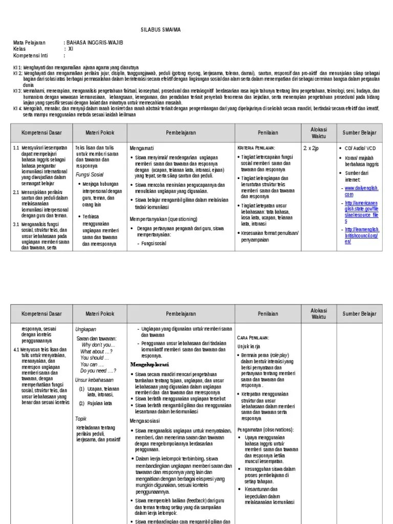 Berkomunikasi dengan bahasa inggris setara . Silabus mata pelajaran bahasa inggris satuan pendidikan mata pelajaran kelas kompetensi inti : Xi (sebelas) kompetensi inti :. Dan unsur kebahasaan lirik lagu terkait kehidupan remaja sma/ma/smk/mak. Silabus bahasa inggris kelas xi semester genap kurikulum 2013 revisi 2017.